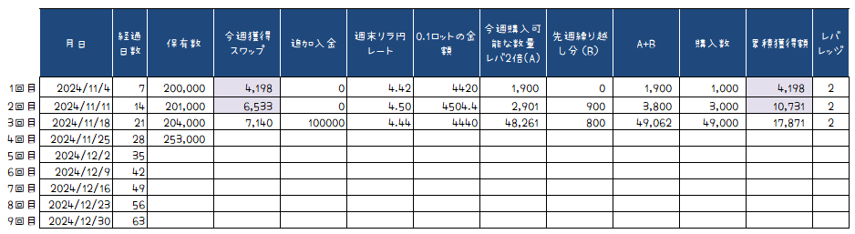 レバレッジ2倍で毎週月曜日に購入していきます。