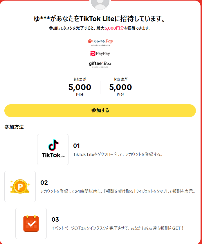 TikTok Liteをこのサイト経由で登録をすると5000円相当のポイントが貰えます!